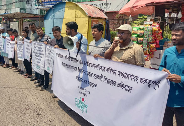 স্টাফ রিপোর্টার : গুম প্রতিরোধসহ মানবাধিকার সুরক্ষায় জারি করা গুরুত্বপূর্ণ অধ্যাদেশগুলো বাতিলের সুপারিশের প্রতিবাদে রাজশাহীতে মানববন্ধন কর্মসূচি পালন করেছে মানবাধিকার সংগঠন ‘অধিকার’। বুধবার বেলা ১১টায় রাজশাহী মহানগরীর অলোকার মোড় চেম্বার ভবনের সামনে এই কর্মসূচি অনুষ্ঠিত হয়।