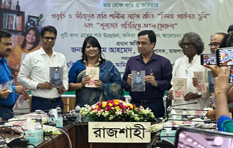 স্টাফ রিপোর্টার: প্রকৃতি ও জীবনের কবি শামীমা নাইস রচিত ‘নিমগ্ন প্রার্থনায় তুমি’ এবং ‘শূন্যতার প্রতিবিম্বে অতল জোছনা’ শীর্ষক দুই কাব্যগ্রন্থের পাঠ উন্মোচিত হয়েছে। গতকাল রবিবার (৬ আগস্ট) বিকালে রাজশাহী জেলা প্রশাসকের সম্মেলন কক্ষে জেলা প্রশাসক (ডিসি) শামীম আহমেদ প্রধান অতিথি থেকে এই কাব্যগ্রন্থ দুটির পাঠ উন্মোচন করেন।
