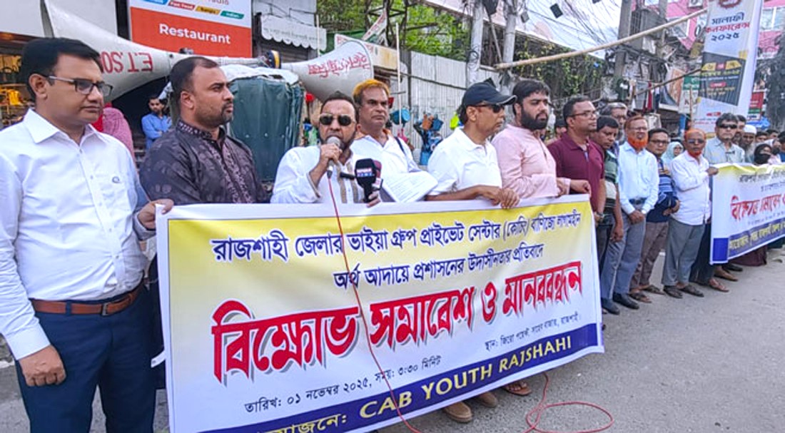 হুমায়ুন কবীর, স্টাফ রিপোর্টার : প্রাইভেট কোচিং বাণিজ্যে প্রশাসনের উদাসীনতার প্রতিবাদে এবং অগ্রিম কোর্স ফি বাতিলসহ ১১ দফা দাবিতে মানববন্ধন করেছে শিক্ষার্থীদের অভিভাবক ও ক্যাব ইউথ গ্রুপ। শনিবার (১ নভেম্বর) বিকেল ৪টায় রাজশাহীর সাহেববাজার জিরোপয়েন্টে এ মানববন্ধন অনুষ্ঠিত হয়।