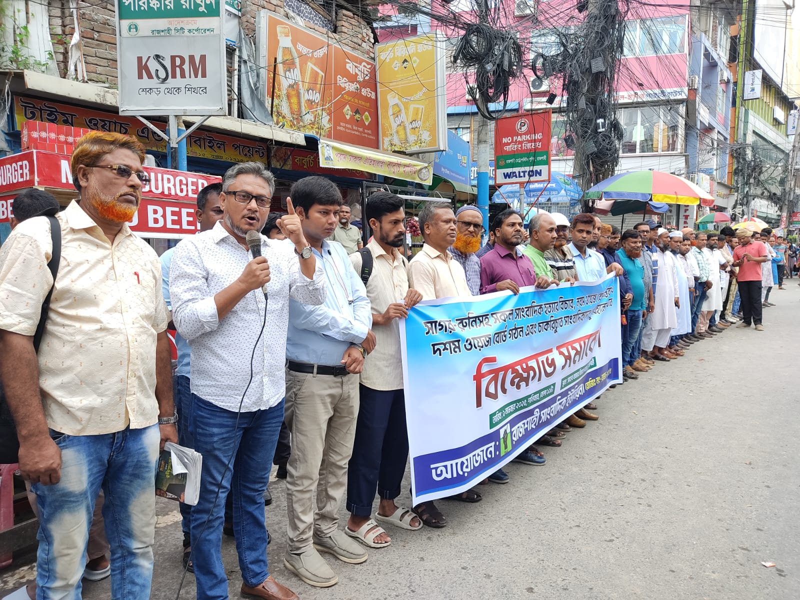 সাগর-রুনিসহ সকল সাংবাদিক হত্যার বিচার, নবম ওয়েজ বোর্ড বাস্তবায়ন ও দশম ওয়েজ বোর্ড গঠন এবং চাকরিচ্যুত সাংবাদিকদের পুনর্বহালসহ বিভিন্ন দাবিতে শনিবার (১ নভেম্বর) বেলা ১১টায় রাজশাহী নগরীর সাহেব বাজার জিরো পয়েন্টে অনুষ্ঠিত এ মানববন্ধন ও বিক্ষোভ সমাবেশে সাংবাদিক নেতারা এসব কথা বলেন।