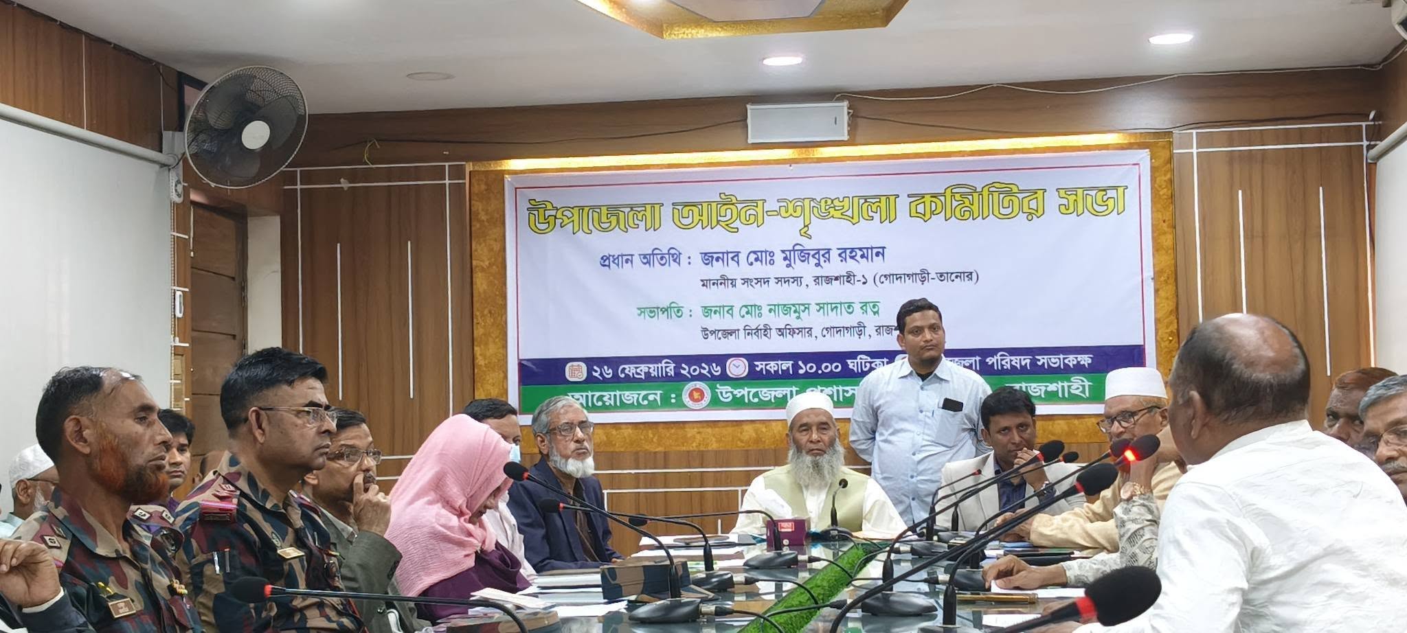 মুক্তার হোসেন, গোদাগাড়ী : রাজশাহীর গোদাগাড়ীতে আইন-শৃঙ্খলা কমিটির মাসিক সভা ও সাধারণ সভা অনুষ্ঠিত হয়েছে। বৃহস্পতিবার বেলা ১১টায় উপজেলা পরিষদ হলরুমে উপজেলা নির্বাহী অফিসার (ইউএনও) নাজমুস সাদাত রত্ন-এর সভাপতিত্বে সভায় প্রধান অতিথি ছিলেন রাজশাহী-১ (গোদাগাড়ী-তানোর) আসনের সংসদ সদস্য অধ্যাপক মুজিবুর রহমান। সভায় উপজেলার বর্তমান পরিস্থিতি ও গুরুত্বপূর্ণ নানা সমস্যা নিয়ে বিস্তারিত আলোচনা করা হয়।