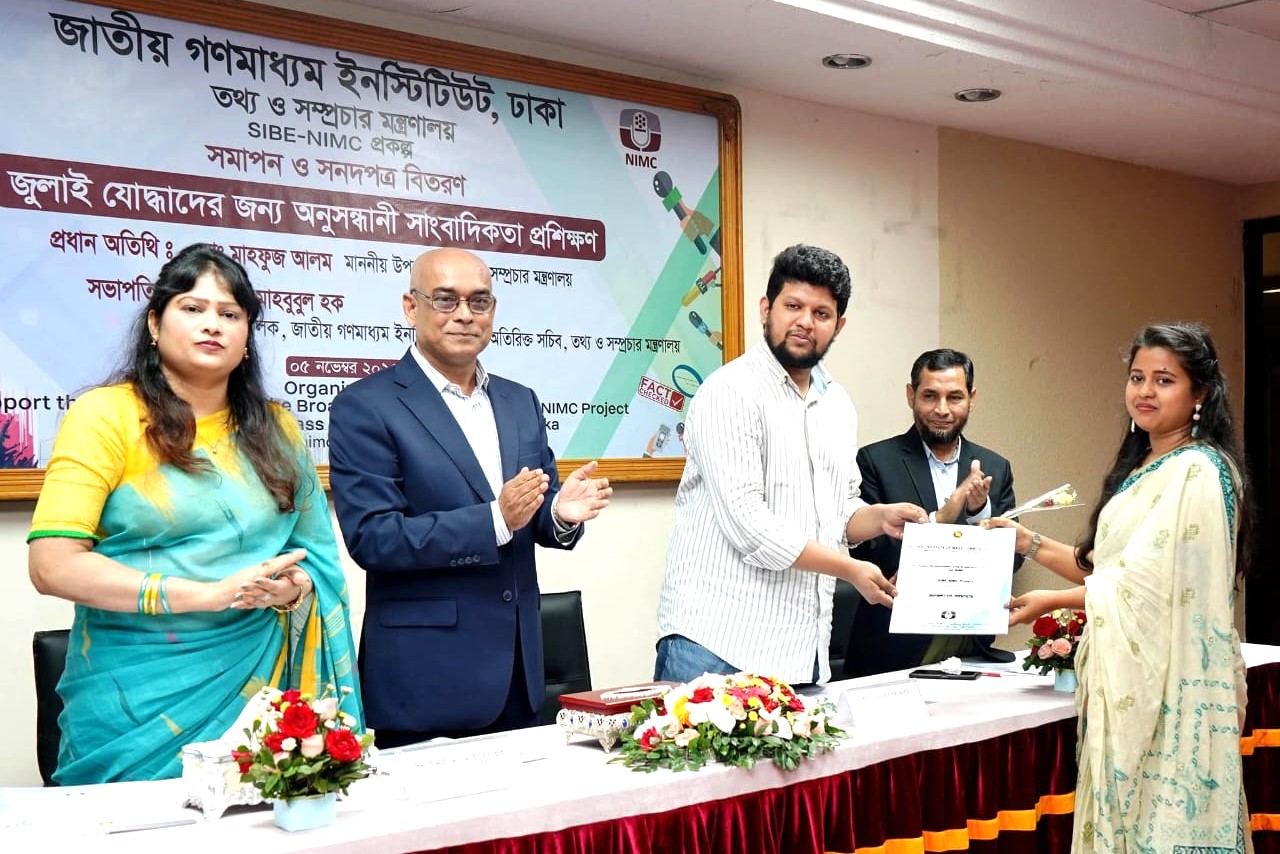জাতীয় গণমাধ্যম ইনস্টিটিউটের মহাপরিচালক নূর মো. মাহবুবুল হকের সভাপতিত্বে অনুষ্ঠানে বক্তব্য দেন ইনস্টিটিউটের উপপরিচালক মোহাম্মদ আবু সাদেক ও উপপরিচালক সুমনা পারভীন। প্রশিক্ষণার্থীদের মধ্য থেকে অনুভূতি ব্যক্ত করেন জুলাই যোদ্ধা আমিনুল ইসলাম ইমন ও সোহেলী তামান্না। তাঁরা যুগোপযোগী প্রশিক্ষণ আয়োজনের উদ্যোগ গ্রহণের জন্য তথ্য ও সম্প্রচার উপদেষ্টার প্রতি কৃতজ্ঞতা প্রকাশ করেন।