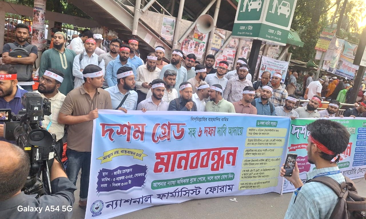 স্টাফ রিপোর্টার : সোমবার (৩ নভেম্বর) জাতীয় প্রেসক্লাবের সামনে ন্যাশনাল ফার্মাসিস্ট ফোরামের ব্যানারে মানববন্ধন অনুষ্ঠিত হয়।
