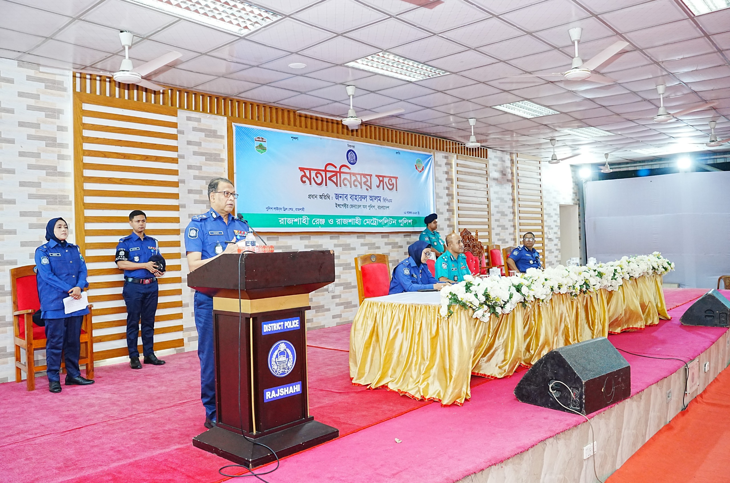 সভায় প্রধান অতিথি হিসেবে উপস্থিত ছিলেন বাংলাদেশের ইন্সপেক্টর জেনারেল অব পুলিশ (আইজিপি) বাহারুল আলম, বিপিএম। মতবিনিময় সভায় স্বাগত বক্তব্য রাখেন রাজশাহী মেট্রোপলিটন পুলিশের সম্মানিত পুলিশ কমিশনার মোহাম্মদ আবু সুফিয়ান মহোদয়। শুভেচ্ছা বক্তব্য প্রদান করেন রাজশাহী রেঞ্জের ডিআইজি জনাব মোহাম্মদ শাহজাহান, পিপিএম (বার), পিএইচডি এবং সভায় সভাপতিত্ব করেন রাজশাহী জেলার পুলিশ সুপার ফারজানা ইসলাম।