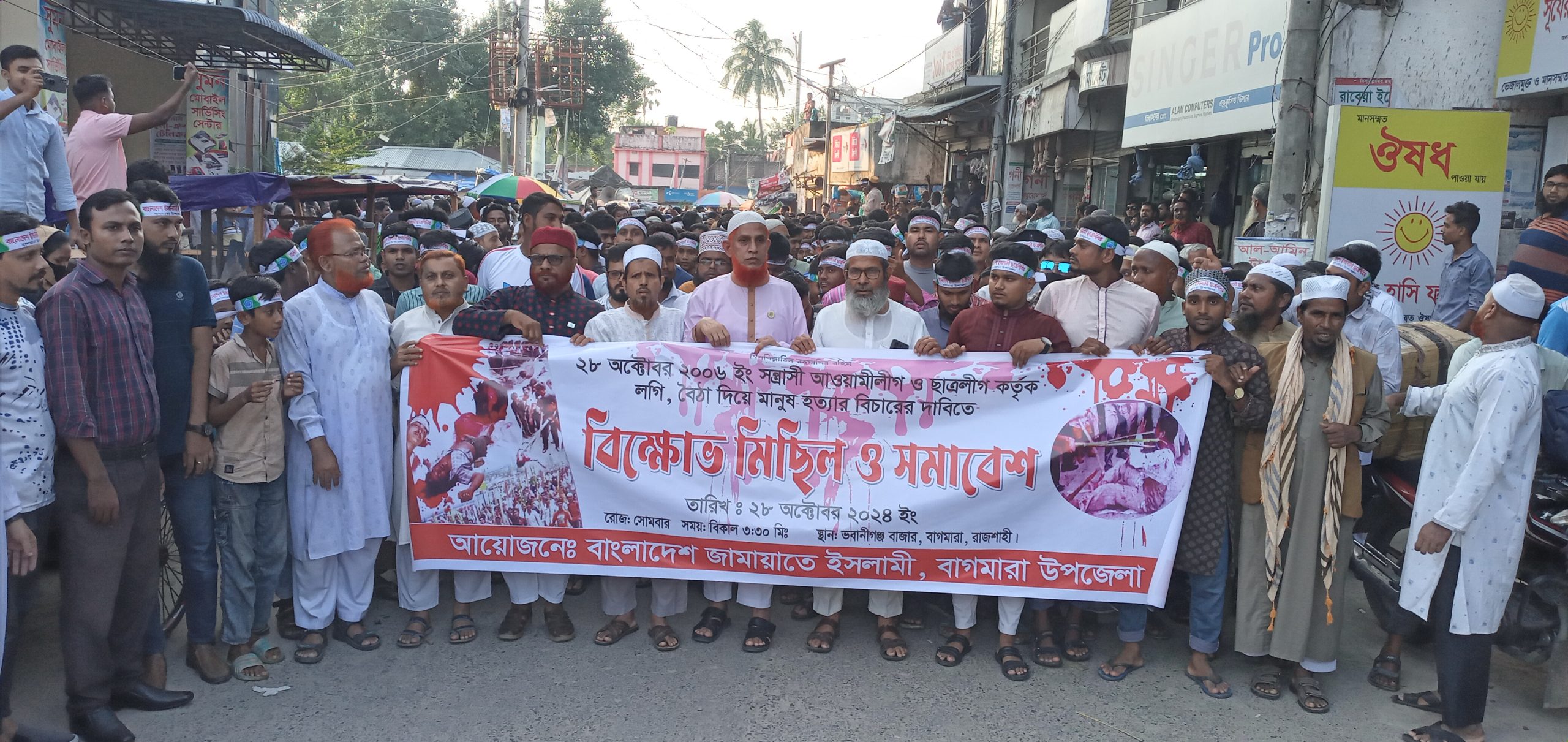 হেলাল উদ্দীন, বাগমারা : রাজশাহীর বাগমারায় বাংলাদেশ জামায়াতে ইসলামীর উদ্যোগে আওয়ামী লীগের লগি-বৈঠার মাধ্যমে ২০০৬ সালের ২৮ অক্টোবর নৃশংস ভাবে খুনের ঘটনার প্রতিবাদে বিক্ষোভ মিছিল ও সমাবেশ করা হয়েছে। সোমবার বিকেলে উপজেলা সদর ভবানীগঞ্জে জামায়াতে ইসলামী বাগমারা শাখার উদ্যোগে বিক্ষোভ মিছিল অনুষ্ঠিত হয়েছে। মিছিল শেষে গোডাউন মোড়ে সমাবেশ করা হয়।