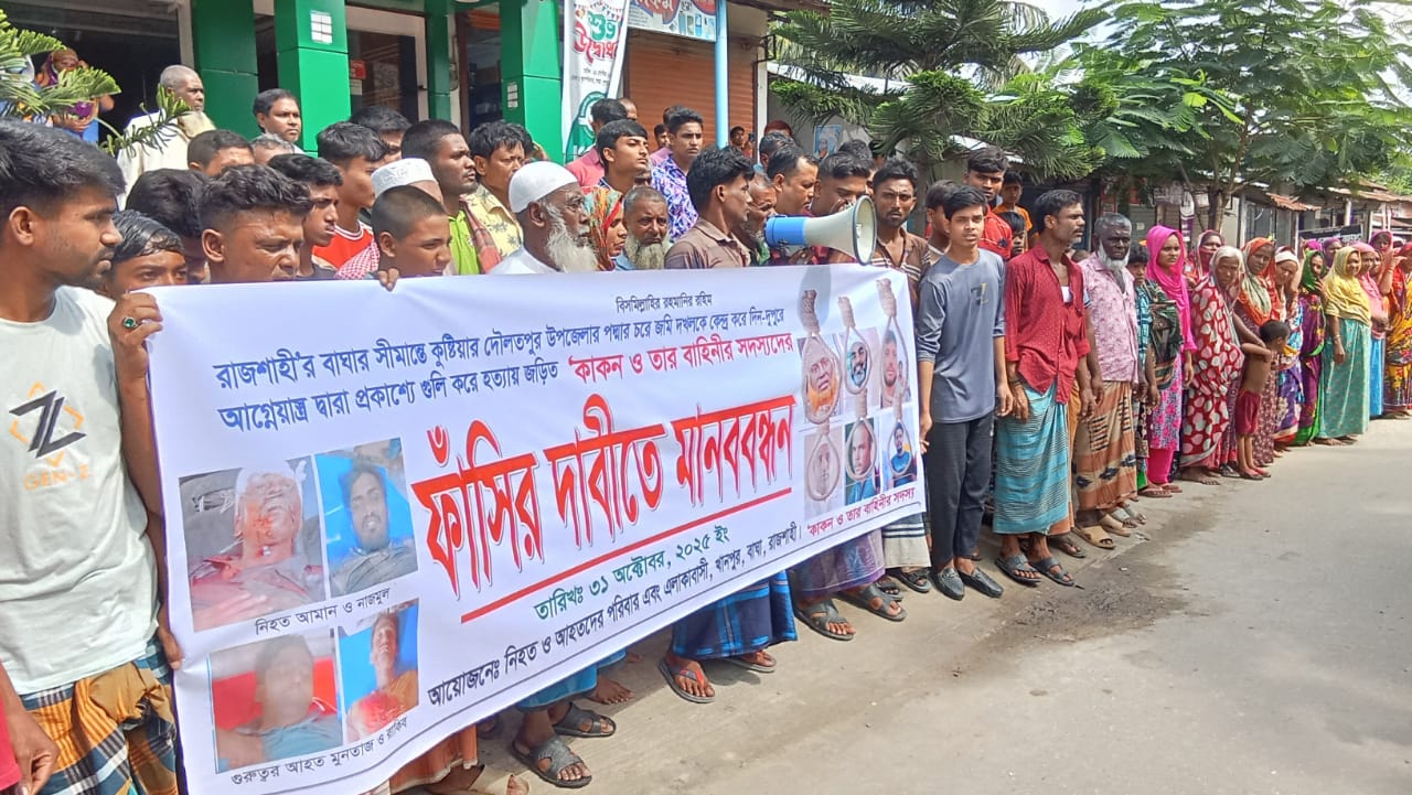 স্টাফ রিপোর্টার, বাঘা : পদ্মার চরে দিনে দুপুরে গুলি করে হত্যায় জড়িত বাহিনীর প্রধান কাঁকনসহ তার সদস্যের ফাঁসির দাবিতে মানববন্ধন করা হয়েছে।