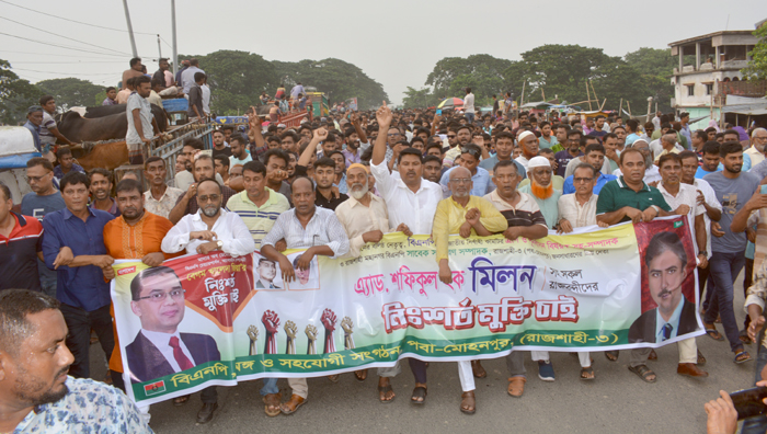 বিএনপি নেতা মিলনের মুক্তির দাবীতে পবায় বিক্ষোভ মিছিল