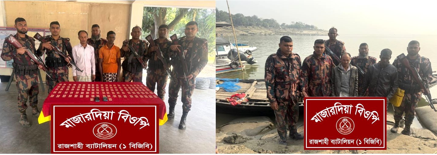 গোপন তথ্য অনুযায়ী দুই জন মাদক ব্যবসায়ী পদ্মা নদীর ওপার থেকে একটি নৌকা নিয়ে টি-বাঁধের দিকে আসছে। নৌকাটি টি-বাঁধে আসলে তৎক্ষনাত বিজিবি’র আভিযানিক দল তল্লাশীর জন্য অগ্রসর হলে নৌকায় থাকা ২ জন মাদক ব্যবসায়ী নৌকা থেকে নদীর পাড়ে লাফ দেয়। তখন বিজিবি’র আভিযানিক দল কর্তৃক আসামী (১) মোঃ বাবু (৩৫), পিতা-মোঃ নজরুল ইসলাম, (২) মোঃ আনোয়ার হোসেন (৩৬), পিতা মোঃ সাইফুল ইসলাম উভয়ের গ্রাম-চরমাজারদিয়া, পোস্ট- রাজশাহী কোর্ট, থানা-দামকুড়া, জেলা-রাজশাহীকে ধাওয়া দিয়ে আটক করে।