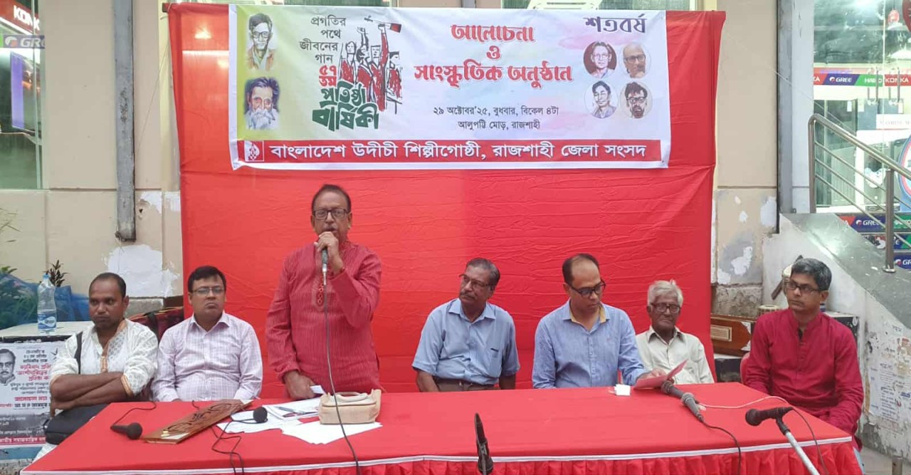 এরপর উদীচী রাজশাহী জেলা সংসদের সভাপতি জুলফিকার আহমেদ গোলাপ’র সভাপতিত্বে ও সাধারণ সম্পাদক শাহিনুর রহমান সোনা’র সঞ্চালনায় আলোচনা সভায় বক্তব্য রাখেন বীর মুক্তিযোদ্ধা শাজাহান আলী বরজাহান, গণসংহতি আন্দোলন রাজশাহী জেলা আহবায়ক এডভোকেট মুরাদ মোর্শেদ, শ্রমিক নেতা কমরেড হুমায়ুন রেজা জেনু, চারণ সাংস্কৃতিক কেন্দ্র রাজশাহীর সংগঠক শামসুল আবেদিন ডন, উদীচী রাজশাহীর সহ-সভাপতি অজিত কুমার মন্ডল। এ সময় নারী নেত্রী কল্পনা রায়, সিপিবি নগর কমিটির সাধারণ সম্পাদক অসিম সরকার লিটন, বাসদ জেলার আহবায়ক আলফাজ হোসেন যুবরাজ, উদীচী রাজশাহী জেলা সংসদের সহ-সভাপতি আফতাব হোসেন কাজল ও রতন ভট্টাচার্য, কোষাধ্যক্ষ সন্তোষ কুমার, সহ-সাধারণ সম্পাদক রণজিৎ দাস ও সাথী আক্তারসহ অন্যরা উপস্থিত ছিলেন।