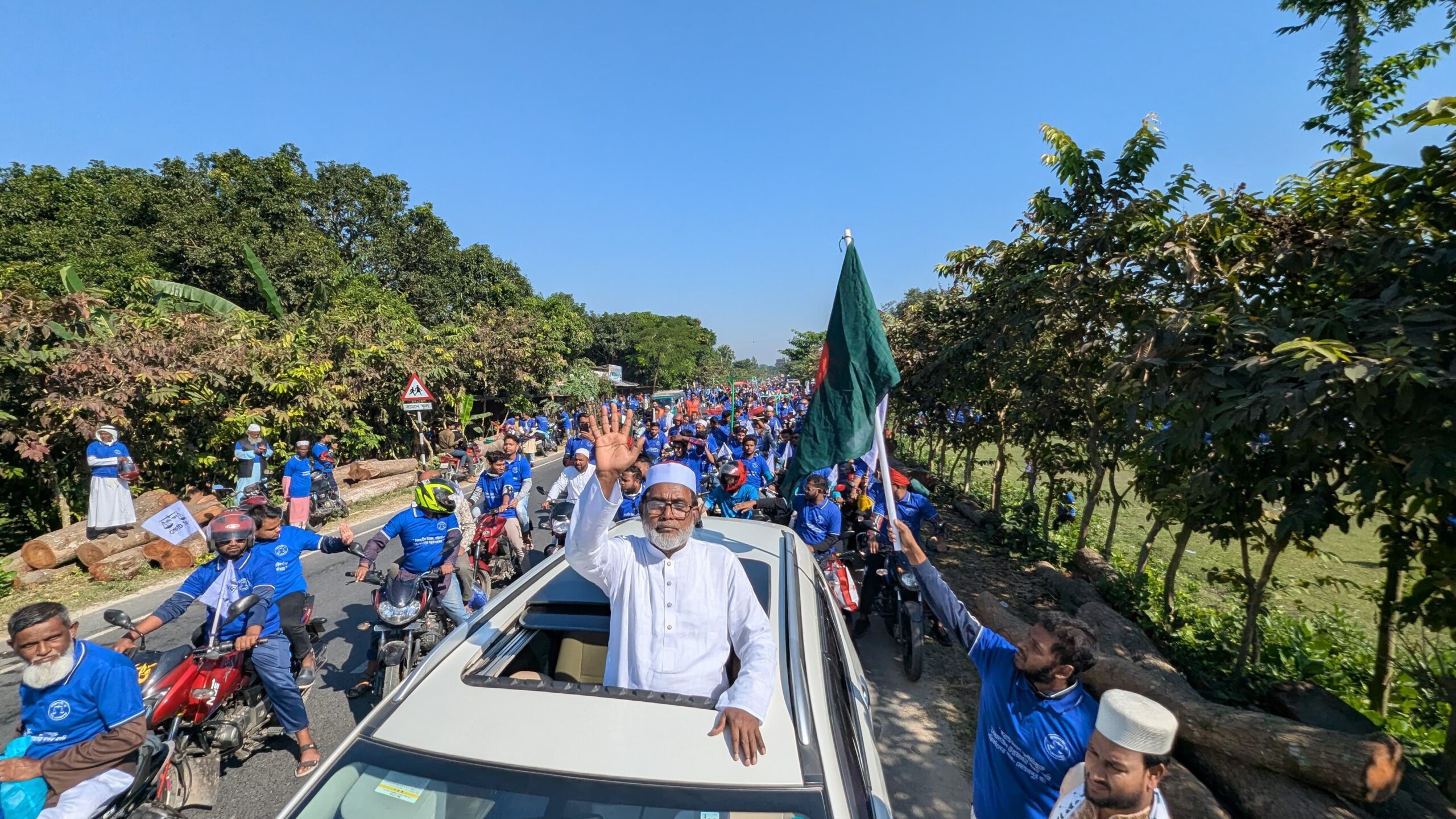 এ সময় ছাদখোলা গাড়ি থেকে রাস্তার দুপাশে দাঁড়িয়ে থাকা মানুষদের হাত নেড়ে শুভেচ্ছা জানান অধ্যাপক আবুল কালাম আজাদ।