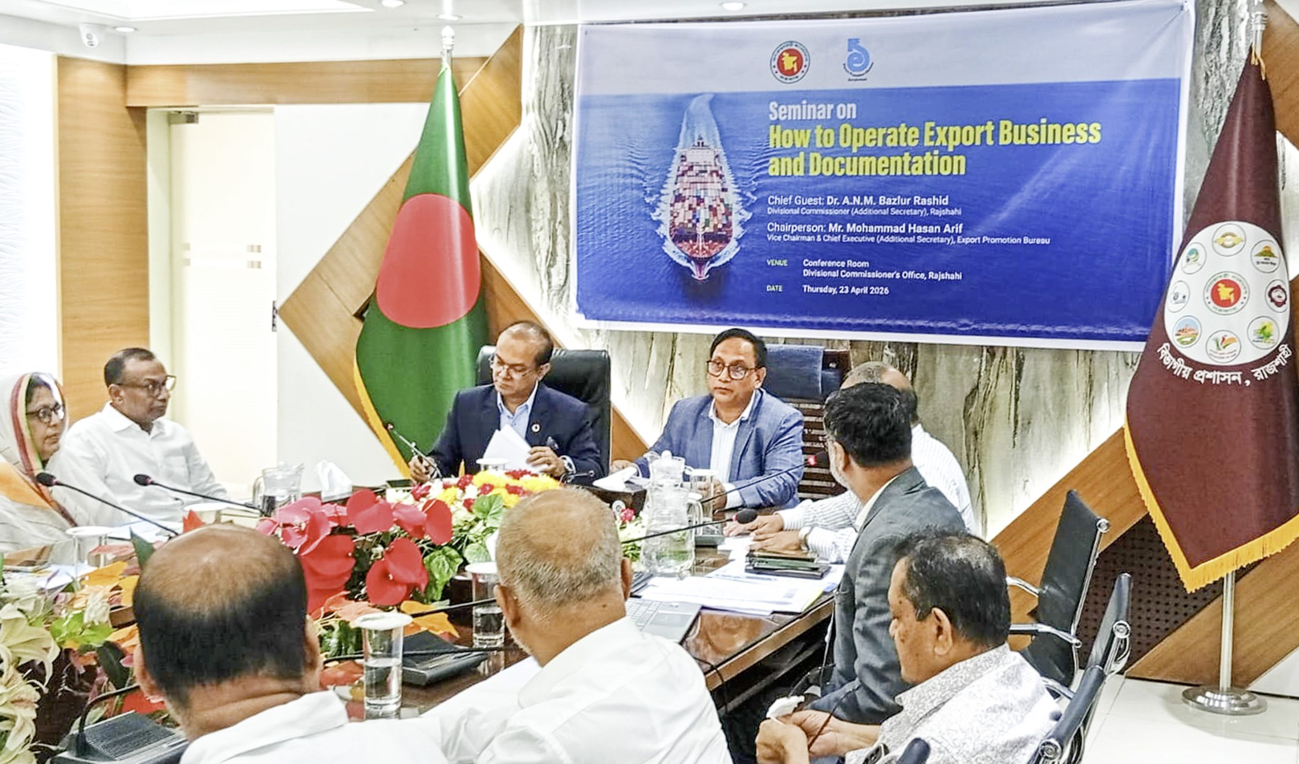 স্টাফ রিপোর্টার : বৃহস্পতিবার (২৩ এপ্রিল) দুপুরে রাজশাহী বিভাগীয় কমিশনার কার্যালয়ের সম্মেলন কক্ষে ‘কীভাবে রপ্তানি বাণিজ্য ও ডকুমেন্টেশন করতে হয়’ শীর্ষক সেমিনার অনুষ্ঠিত হয়। বাংলাদেশ রপ্তানি উন্নয়ন ব্যুরো’র সহ-সভাপতি ও প্রধান নির্বাহী মোহাম্মদ হাসান আরিফ এর সভাপতিত্বে অনুষ্ঠানে প্রধান অতিথি হিসেবে উপস্থিত ছিলেন বিভাগীয় কমিশনার ড. আ. ন. ম. বজলুর রশীদ। বিভাগীয় প্রশাসনের সহযোগিতায় রপ্তানি উন্নয়ন ব্যুরো এ সেমিনার আয়োজন করে।