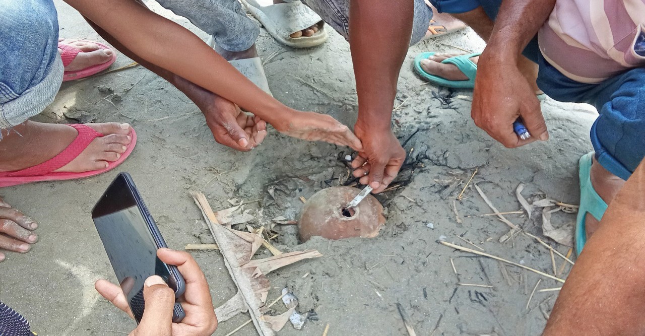 দুপুরে ঘটনাস্থলে গিয়ে দেখা যায়, নদীর পানি ও পাড়ের বালু বিভিন্ন স্থান থেকে বুদ্বুদ উঠছে। বালুর মধ্যে ওঠা বুদ্বুদগুলো থেকে গ্যাস বের হওয়ার শব্দ শোনা যাচ্ছে।