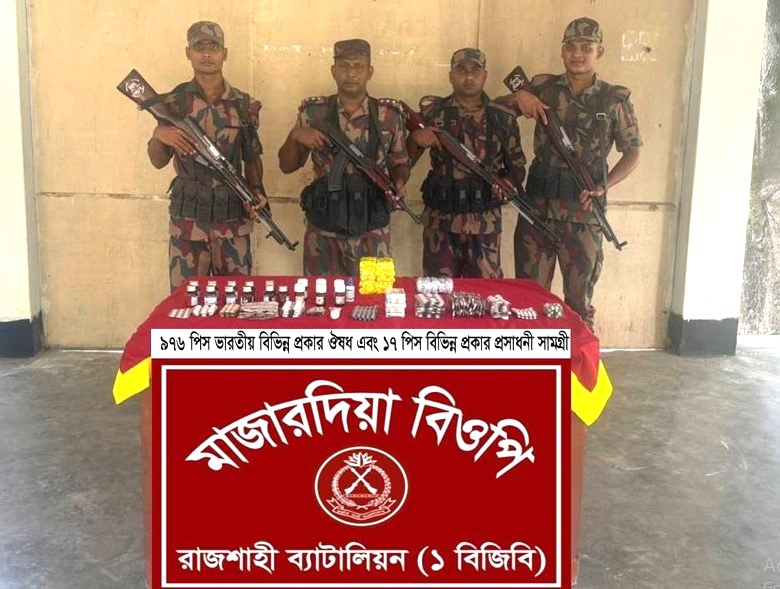 বিজিবি জানায়, শুক্রবার ৭ নভেম্বর আনুমানিক ১১:০৫ টায় অত্র ব্যাটালিয়নের অধীনস্থ মাজারদিয়া বিওপি’র দায়িত্বপূর্ণ এলাকায় বিজিবি’র নিয়মিত টহল দল সীমান্ত পিলার ১৬৪/২-এস হতে আনুমানিক ৫ কিঃমিঃ বাংলাদেশের অভ্যন্তরে রাজশাহী জেলার রাজপাড়া থানাধীন আইবাধ নামক এলাকায় অভিযান পরিচালনা করে মালিকবিহীন পরিত্যক্ত অবস্থায় ৯৭৬ পিস ভারতীয় বিভিন্ন প্রকার ঔষধ এবং ১৭ পিস বিভিন্ন প্রকার প্রসাধনী সামগ্রী আটক করে ।