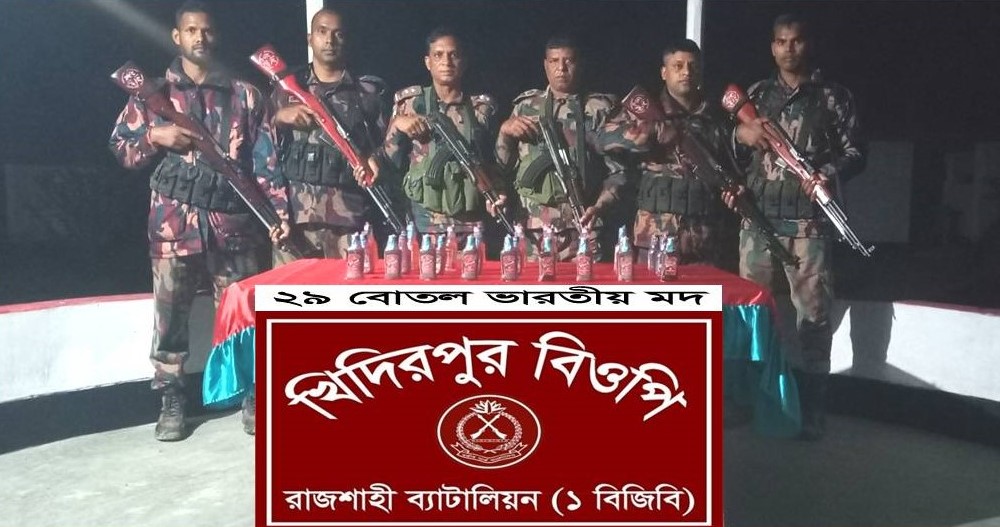 শনিবার ৮ নভেম্বর রাত্রি আনুমানিক সারে এগারটায় রাজশাহী ব্যাটালিয়ন (১ বিজিবি) এর অধীনস্থ খিদিরপুর বিওপি‘র দায়িত্বপূর্ণ এলাকায় বিজিবির নিয়মিত একটি টহল দল সীমান্ত পিলার ১৫৮/২-এস হতে আনুমানিক ৩০০ গজ বাংলাদেশের অভ্যন্তরে রাজশাহী জেলার কাটাখালী থানাধীন পশ্চিম বাতান নামক স্থানে অভিযান পরিচালনা করে মালিকবিহীন ০১টি প্লাষ্টিকের বস্তায় ২৯ বোতল ভারতীয় মদ আটক করতে সক্ষম হয় বলে সংবাদ বিজ্ঞপ্তিতে জানান ব্যাটালিয়ন (১ বিজিবি)।