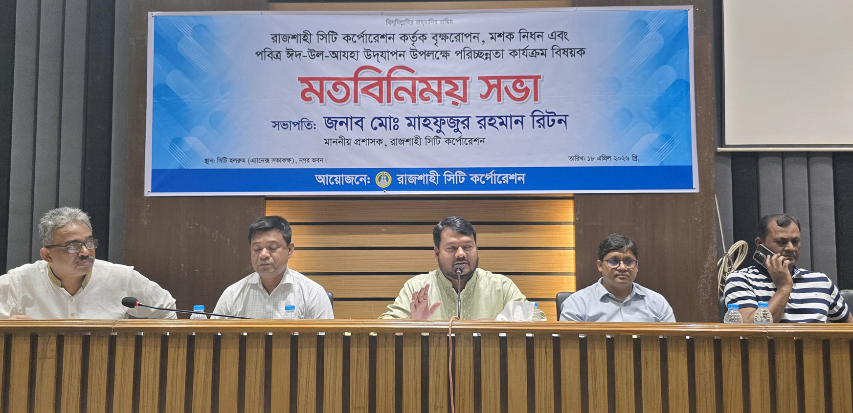সংবাদ বিজ্ঞপ্তি : রাজশাহী সিটি কর্পোরেশনের উদ্যোগে বৃক্ষরোপণ, মশক নিধন এবং আসন্ন পবিত্র ঈদুল আযহা উপলক্ষে পরিচ্ছন্নতা কার্যক্রম বিষয়ক মতবিনিময় সভা অনুষ্ঠিত হয়েছে। শনিবার (১৮ এপ্রিল) দুপুরে নগর ভবনের সিটি হলরুমে অনুষ্ঠিত সভায় সভাপতিত্ব করেন রাজশাহী সিটি কর্পোরেশনের প্রশাসক মোঃ মাহফুজুর রহমান রিটন। সভাপতির বক্তব্যে রাসিক প্রশাসক আসন্ন ঈদুল আযহা উপলক্ষে নগরীর সার্বিক পরিচ্ছন্নতা নিশ্চিতকরণ, নিয়মিত মশক নিধন কার্যক্রম জোরদার এবং ব্যাপক বৃক্ষরোপণ কর্মসূচি বাস্তবায়নের ওপর গুরুত্বারোপ করেন। তিনি সংশ্লিষ্ট সকলকে আন্তরিকতা ও দায়িত্বশীলতার সাথে কাজ করার আহ্বান জানান।