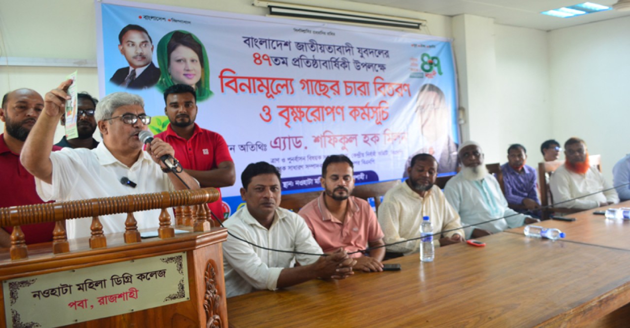 বৃহস্পতিবার সকাল সোয়া ১০টায় রাজশাহীর নওহাটা পৌরসভার নওহাটা মহিলা কলেজে বাংলাদেশ জাতীয়তাবাদী যুবদলের ৪৭তম প্রতিষ্ঠাবার্ষিকী উপলক্ষে জেলা যুবদলের যুগ্ম আহ্বায়ক কে.এইচ. রানা শেখের আয়োজনে বিনামূল্যে গাছের চারা বিতরণ ও বৃক্ষরোপণ কর্মসূচির উদ্বোধন করেন বিএনপি জাতীয় নির্বাহী কমিটির ত্রাণ ও পুনর্বাসন বিষয়ক সহ-সম্পাদক ও রাজশাহী মহানগর বিএনপির সাবেক সাধারণ সম্পাদক অ্যাডভোকেট শফিকুল হক মিলন।
