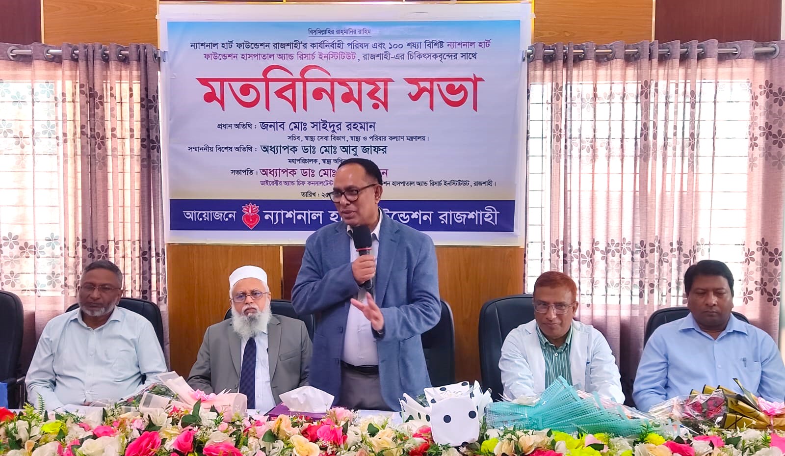 সভায় সভাপতিত্ব করেন ন্যাশনাল হার্ট ফাউন্ডেশন হাসপাতাল অ্যান্ড রিসার্চ ইনস্টিটিউট রাজশাহীর ডাইরেক্টর ও চিফ কনসালটেন্ট অধ্যাপক ডা. মো. রইছ উদ্দিন। বিশেষ অতিথি ছিলেন স্বাস্থ্য অধিদপ্তরের মহাপরিচালক অধ্যাপক ডা. মো. আবু জাফর, বিভাগীয় পরিচালক (স্বাস্থ্য) ডা. মো. হাবিবুর রহমান এবং সিভিল সার্জন ডা. এসআইএম রাজিউল করিম। ফাউন্ডেশনের নির্বাহী সদস্য এনামুল হকের সঞ্চালনায় স্বাগত বক্তব্য রাখেন ফাউন্ডেশনের (ভারপ্রাপ্ত) সাধারণ সম্পাদক লিয়াকত আলী। আরও বক্তব্য রাখেন- ফাউন্ডেশনের নির্বাহী সদস্য ডা. মো. ওয়াসিম হোসেন।সভায় আরও উপস্থিত ছিলেন- ফাউন্ডেশনের কার্যনির্বাহী পরিষদ ও ১০০ শয্যা বিশিষ্ট ন্যাশনাল হার্ট ফাউন্ডেশন হাসপাতাল অ্যান্ড রিসার্চ ইনস্টিটিউট, রাজশাহীর চিকিৎসকবৃন্দ।